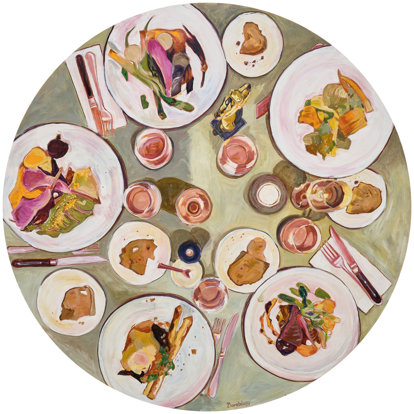 Festészetem középpontjában a megterített étkezőasztal áll. Első pillantásra csendéletnek tűnik, valójában azonban ez a hétköznapi helyszín mély szimbolikus jelentést hordoz. Az asztal számomra találkozási pont: a családi történetek, az ünnepek és a hétköznapok, a jelenlét és a hiány, a közelség és a távolság egyszerre jelenik meg rajta. Festményeimen az elrendezett tárgyak, az üres vagy éppen használt tányérok, poharak és textúrák mind-mind emberi kapcsolatok lenyomatai.